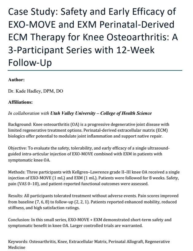 All three participants tolerated the injection without adverse events, supporting the short-term safety of intra-articular EXO-MOVE + EXM therapy. Clinically meaningful pain reduction and functional improvements were observed within 12 weeks. While preliminary, these outcomes suggest that perinatal-derived ECM therapies may provide durable symptomatic relief and improved joint function in patients with knee OA.