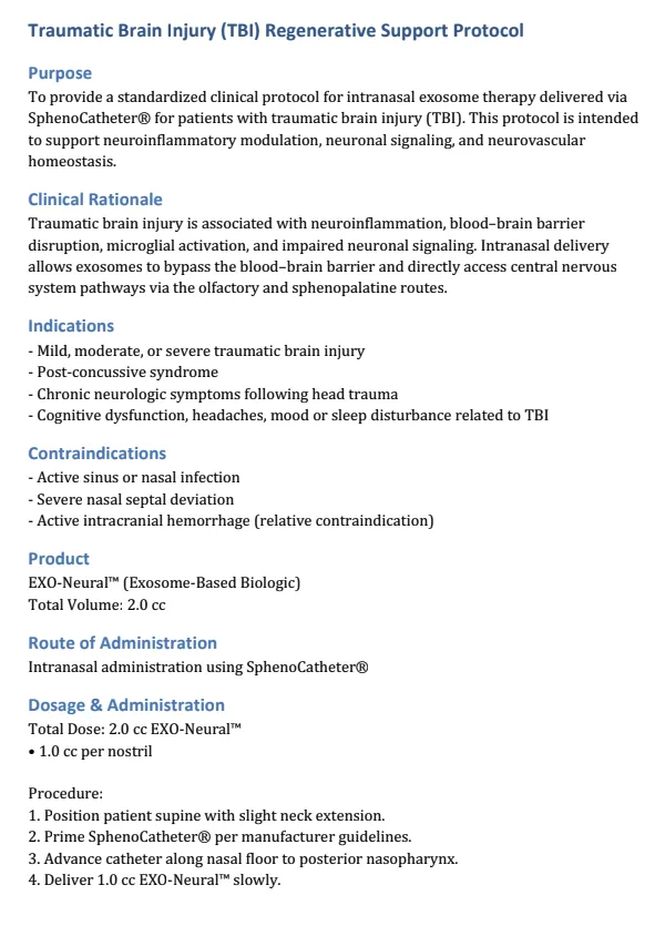 This therapy is investigational. Exosome-based products are not FDA-approved for the treatment of traumatic brain injury. This protocol is not intended to diagnose, treat, cure, or prevent disease.